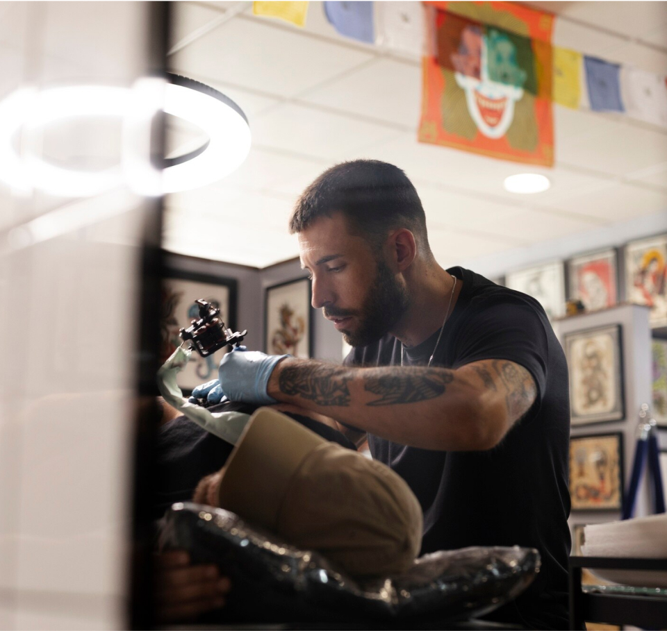 Somos un equipo de artistas apasionados por crear tatuajes únicos. Cada diseño que hacemos es personalizado, cuidando cada detalle para que sea tan especial como tú. Aquí no hacemos arte en serie; hacemos arte para ti.